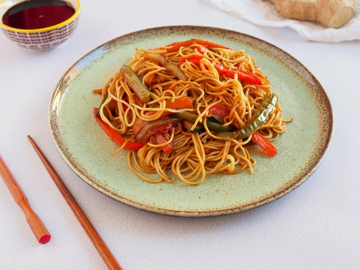 Un plato de fideos con verduras generalmente incluye fideos, diversas verduras (como pimientos, zanahorias, cebollas), salsa de soja y aceite para cocinar. A continuación, te doy una estimación aproximada de las calorías: